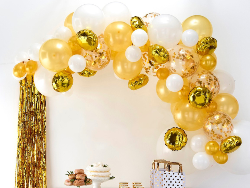 Lyft din fest till nästa nivå med denna lyxiga ballongbåge i klassiskt guld och vitt. Perfekt för bröllop, jubileum, födelsedagar eller andra tillfällen där elegans står i centrum.