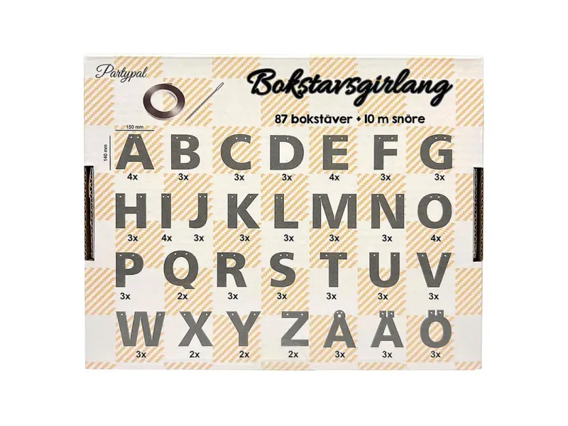 - Innehåll: 87 bokstäver och 10 meter snöre