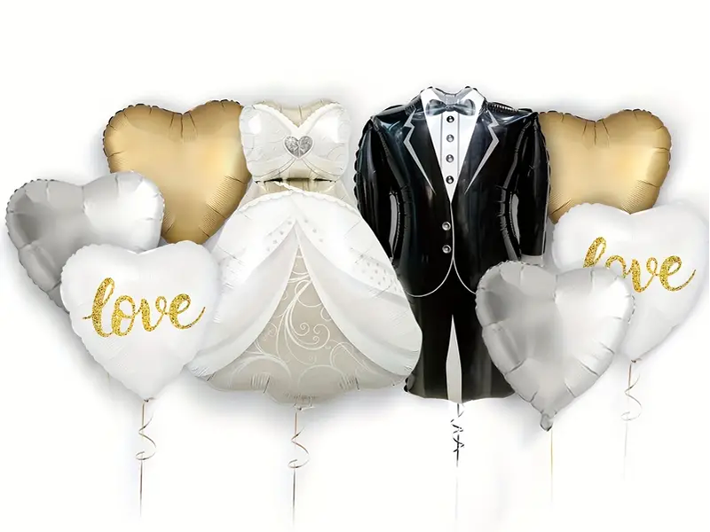 Låt kärlekens festligheter stiga till nya höjder med vårt exklusiva bröllopsballongkit. Med en elegant mix av färger och mönster är detta kit perfekt för att skapa en romantisk atmosfär på er stora dag. Varje ballong är noga utvald för att komplettera brudgummens och brudens utstyrsel samt för att förstärka kärlekens budskap. Kitet innehåller: 1x Brudklänning. 1x Kostym. 2x Guldhjärtan. 2x Silverhjärtan. 2x Vita hjärtan med texten "love" i guld.