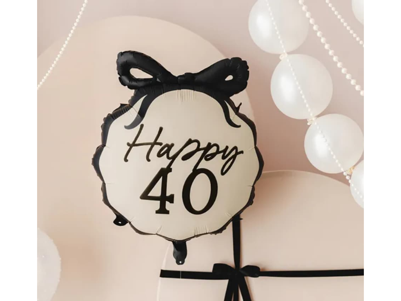 Gör 40-årsfesten extra stilfull med denna eleganta folieballong! Ballongen har en vit botten med svart text Happy 40 och en dekorativ svart rosett ovanpå. Perfekt för att skapa en lyxig och festlig atmosfär.