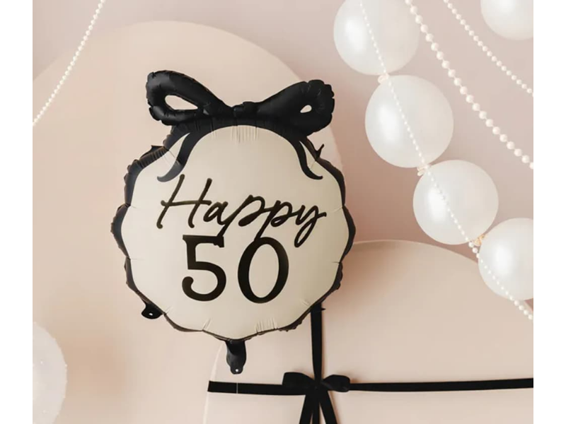 Fira 50-årsdagen med stil! Denna eleganta folieballong har en gräddvit botten med svart text Happy 50 och en dekorativ svart rosett ovanpå. Perfekt för att skapa en sofistikerad och festlig känsla på 50-årskalaset.