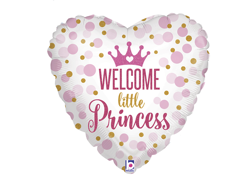 Dekorera för den nya lilla prinsessans ankomst med denna utsökta "Welcome Little Princess" folieballong. Formad som ett hjärta och elegant designad i vit med härliga rosa och guldiga detaljer. Denna ballong är den perfekta inredningsdetaljen för baby shower och för firande av ankomst.