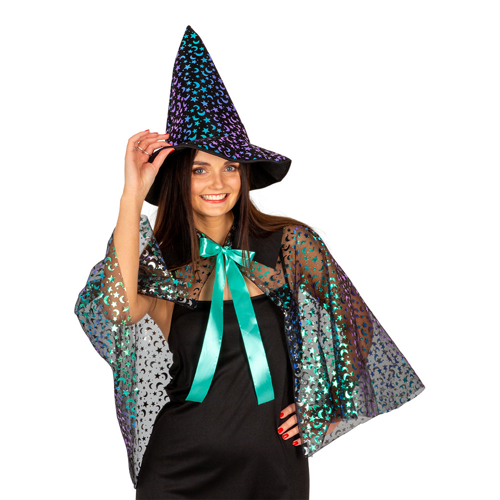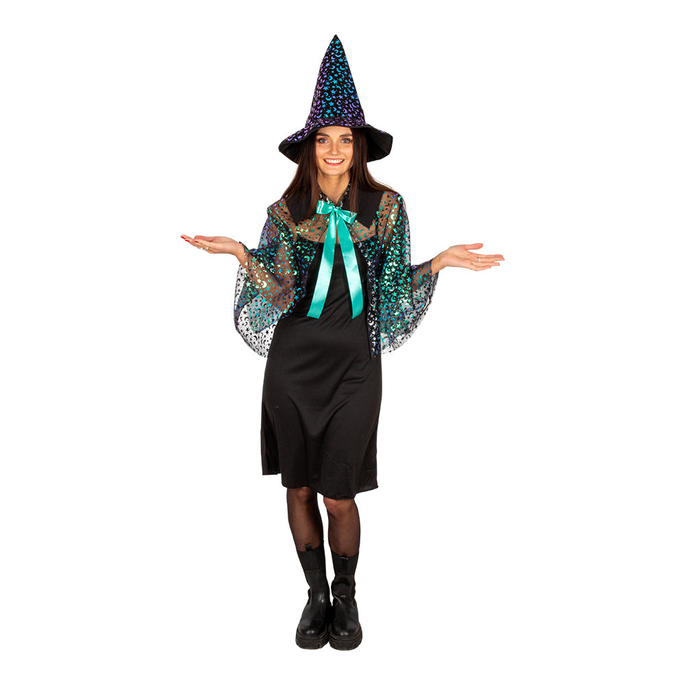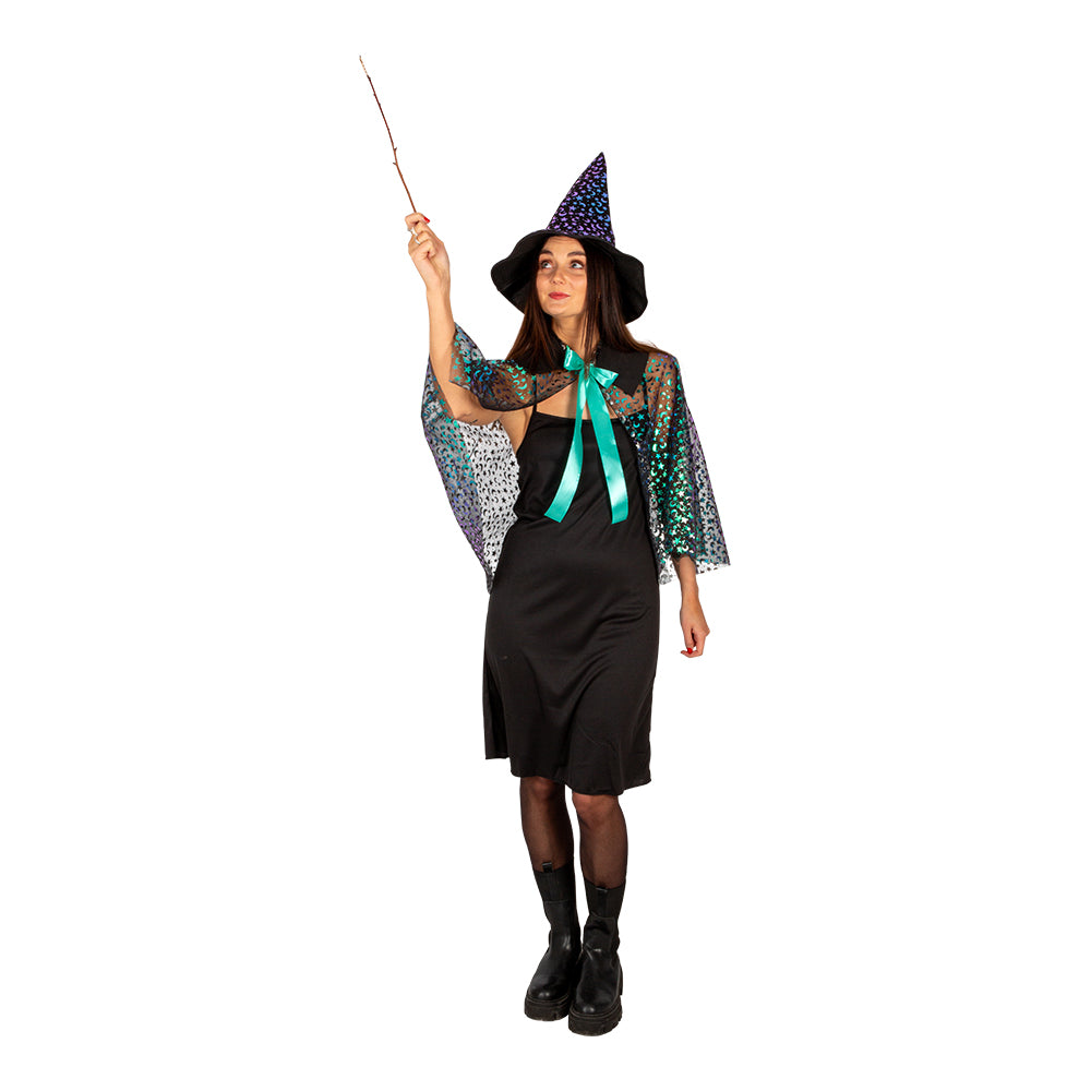 De glittrande ärmarna och det turkosa sidenbandet runt halsen ger dräkten en modern, sagolik känsla, medan den klassiska häxhattens form fulländar utstyrseln. En bekväm one-size-modell (ca 42) som sitter snyggt på de flesta och låter dig röra dig fritt hela kvällen – oavsett om du trollar, dansar eller sprider skräck.