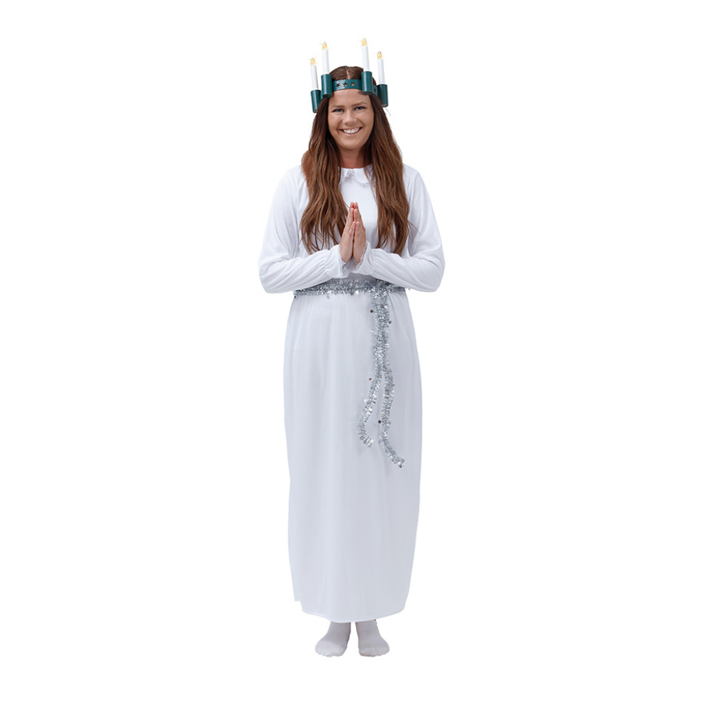 Ge ditt luciafirande eller juluppträdande ett stilrent och traditionellt uttryck med detta lucialinne. Linnet är designat i en ren vit färg och tillverkat i slitstark polyester vilket gör det bekvämt att bära både under skol‑ eller företagsfirande och vid hemmahögtider. Observera att endast linnet ingår - krona, band eller ljustillbehör medföljer inte.