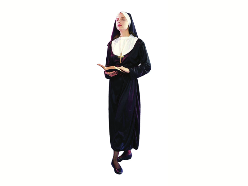 Dräkten innehåller en elegant svart klänning med vit krage samt matchande huvudbonad för den rätta looken. Komplettera gärna med ett kors för att göra outfiten komplett!