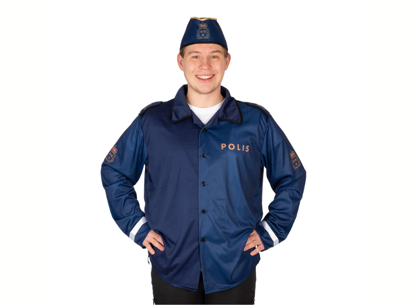 Klä ut dig till lagens väktare med denna skjorta och hatt som påminner om en svensk poliskonstapel! Perfekt för maskerader, temafester eller roliga uppträdanden.