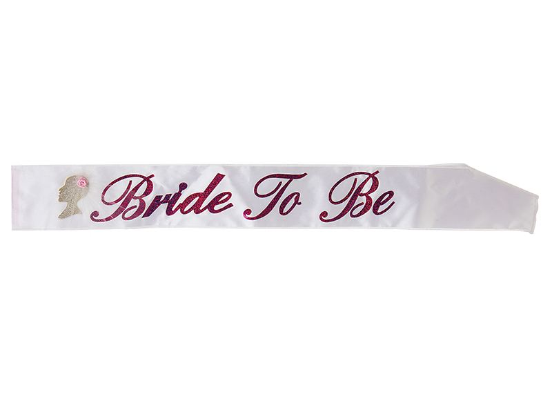 Markera den blivande brudens speciella status med detta eleganta "Bride To Be" ordensband. Detta är en perfekt accessoar för möhippan, vackert utformad i vitt med text i glittrande rosa.