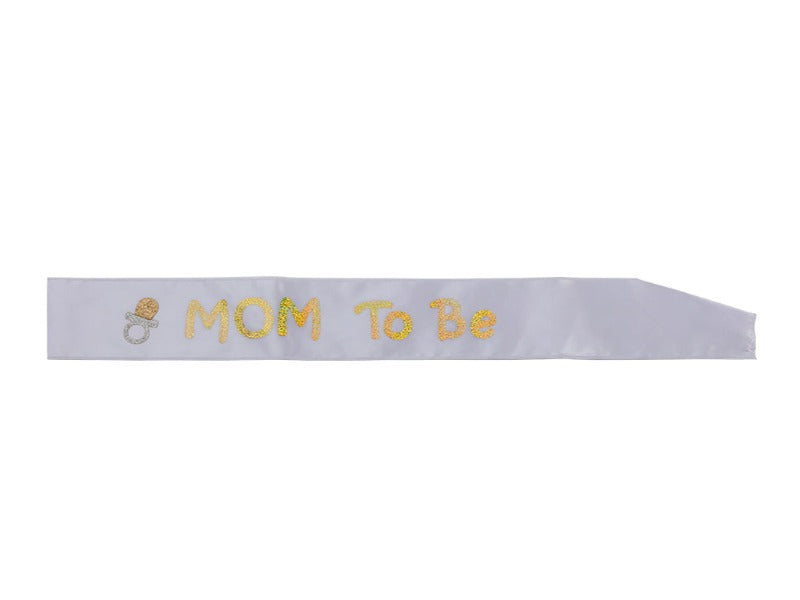 Dekorera den blivande mammans firande med detta "Mom to Be" ordensband. Bandet, designat i en sofistikerad vit nyans, framhäver en elegant glittrig text och är dekorerat med en söt napp av fina gulddetaljer. Denna kombination ger en elegant och tidlös känsla som passar perfekt för baby showers.
