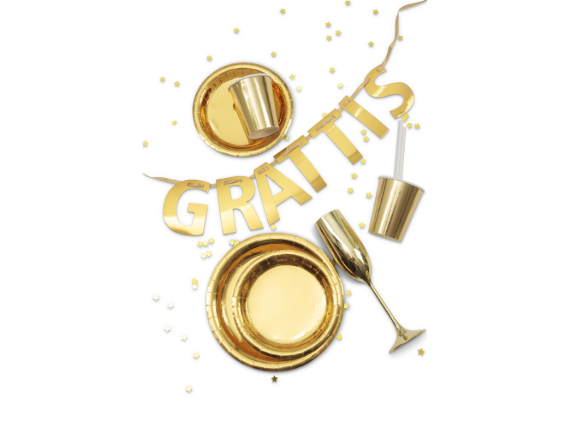 Matcha gärna med våra guldiga tallrikar, muggar och servetter för en stilren och festlig dukning!