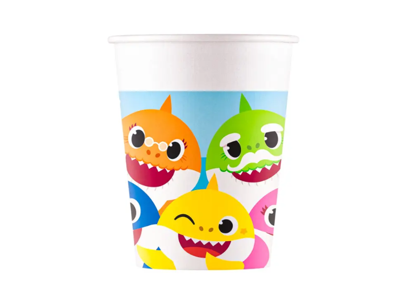 Fyll på med festlig dryck i dessa färgglada pappersmuggar med Baby Shark-motiv! Perfekta för barnkalas och temafester där den populära hajfamiljen står i centrum. Muggarna rymmer 200 ml och passar utmärkt till saft, läsk eller vatten.