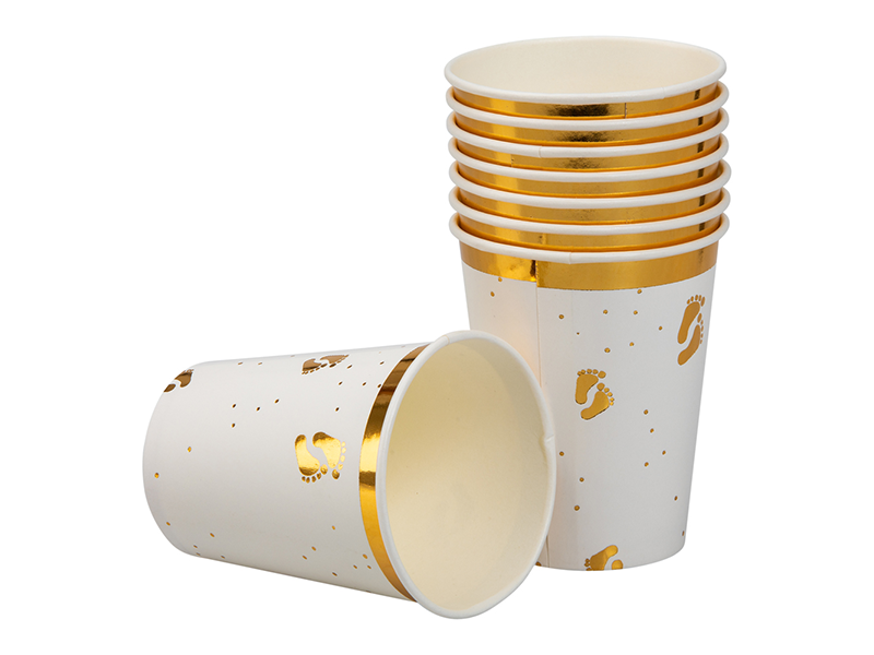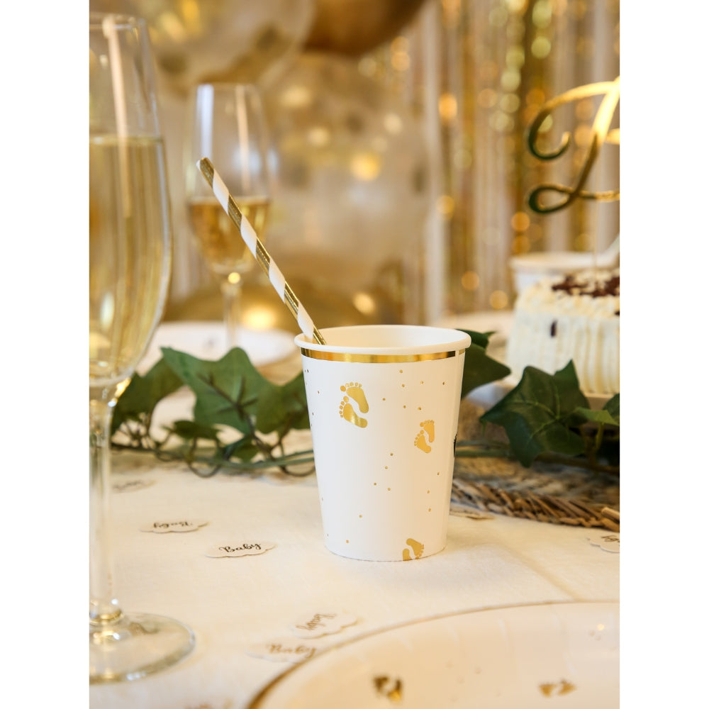 Höj stämningen vid ditt nästa firande med dessa dekorativa pappersmuggar. Varje mugg är vackert utformad med små barnfotavtryck i guld som dansar över en klassisk vit bakgrund, punkterad med fina guldprickar. En matchande guldkant fulländar det stilfulla utseendet. Perfekta för baby showers eller för att fira ett nytt liv, dessa muggar kommer i ett praktiskt 8-pack och är redo att fyllas med glädje!