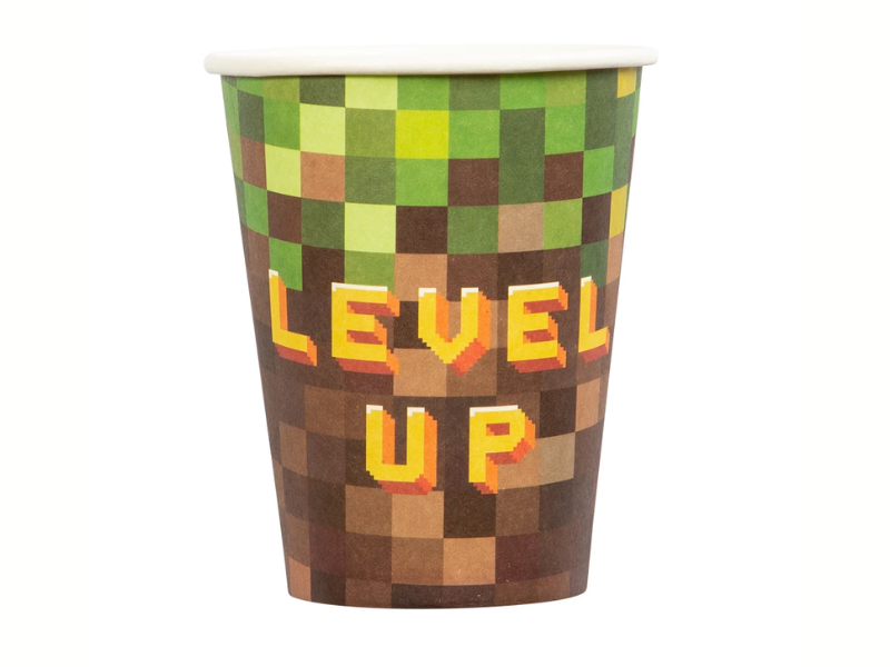 Ge kalaset en pixelperfekt känsla! Dessa pappersmuggar med motivet Pixel Level Up passar perfekt för alla små gamers och spelälskare.