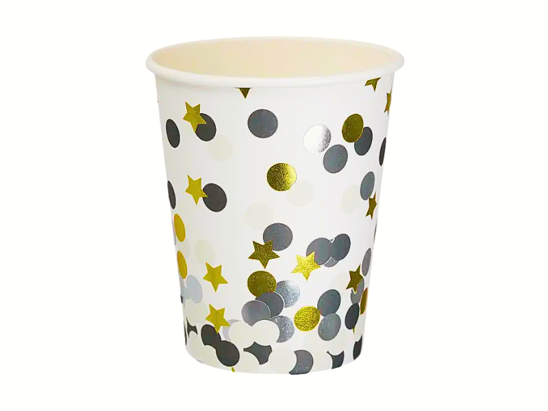 Höj feststämningen med dessa eleganta pappersmuggar dekorerade med glittriga stjärnor och prickar i guld, silver och svart. Perfekta för allt från nyårsfesten till födelsedagar, jubileum eller temakalas.