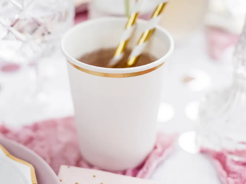 Dessa eleganta pappersmuggar ger en lyxig touch till vilken tillställning som helst med sin rena vita design och sofistikerade guldkant. Perfekt för babyshower, gender reveal, bröllop eller andra eleganta sammanhang. I 6-packet finns muggar som är lika praktiska som de är stilrena, redo att servera dina gäster med både varma och kalla drycker. Låt dessa muggar vara det subtila, men ändå iögonfallande, inslaget som kompletterar din festdekoration!
