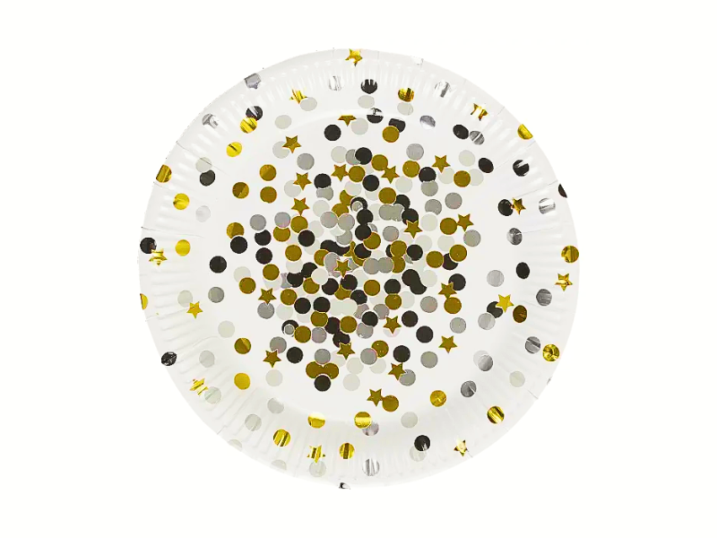 Skapa en elegant festdukning med dessa papperstallrikar med stilrent mönster av stjärnor och prickar i guld, silver och svart. Perfekta för nyår, födelsedagar, temafester eller andra festliga tillfällen där du vill addera lite extra glans.