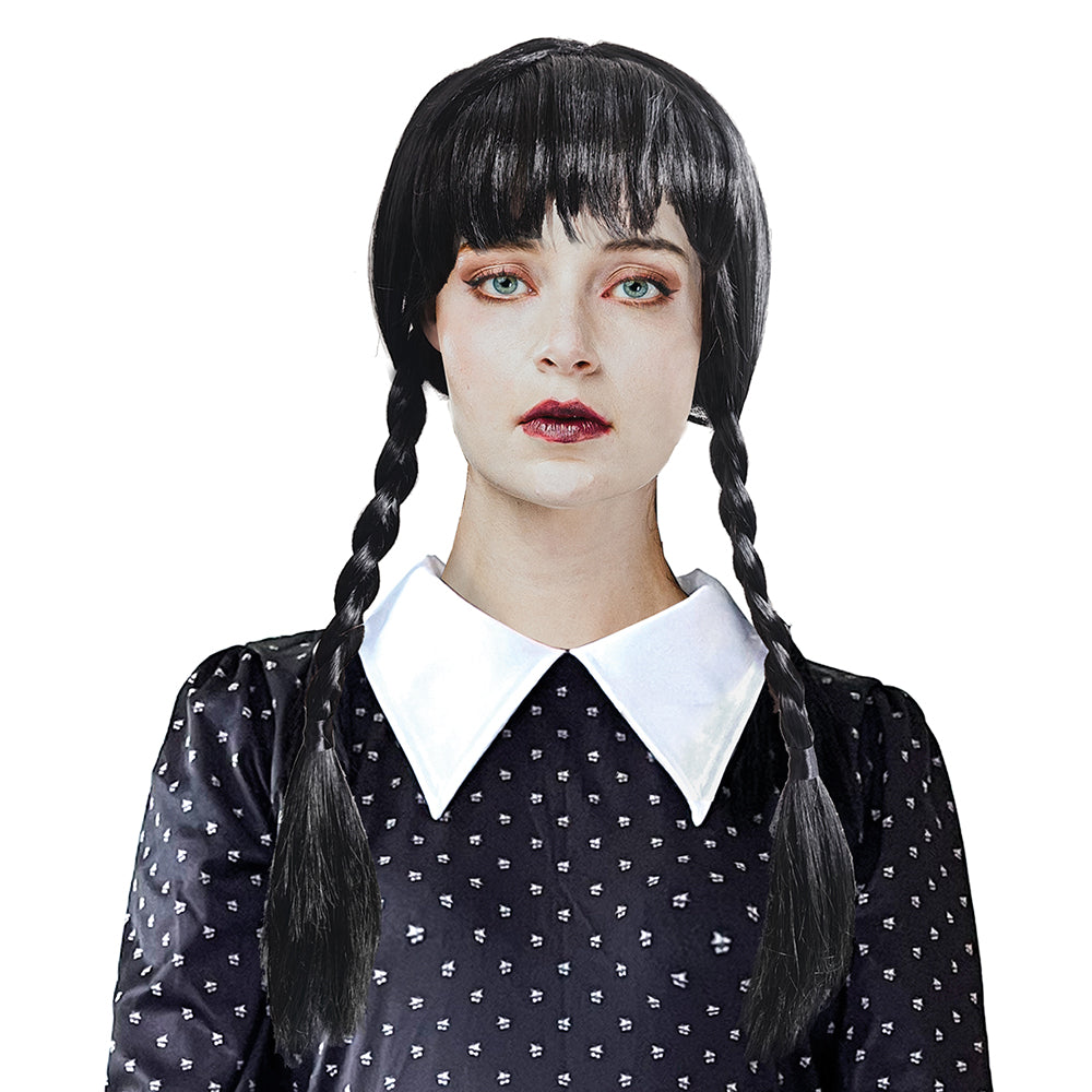 Förvandla din look pĂ„ sekunder med denna svarta peruk med flĂ€tor â perfekt till Halloween, maskerad eller temafester. Den mörka, glansiga frisyren med tvĂ„ flĂ€tor och rak lugg ger en ikonisk och mystisk stil som passar lika bra för en gotisk karaktĂ€r som en klassisk filmfavorit.