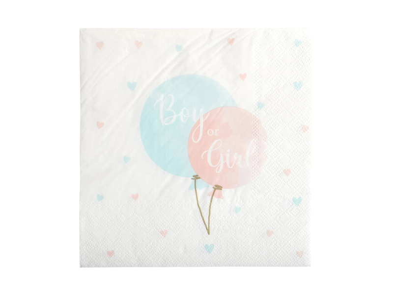 Duka festligt inför gender reveal med dessa stilfulla servetter! Med vita servetter dekorerade med söta ballonger i ljusblått och ljusrosa samt texten "Boy or Girl", skapar du en lekfull och stämningsfull känsla till firandet.
