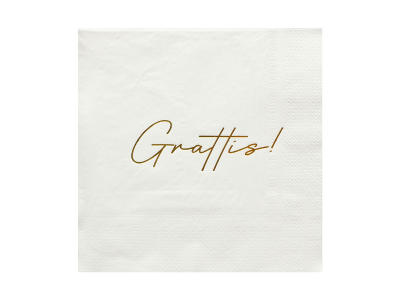 Fira stort med dessa eleganta vita pappersservetter med texten "Grattis!" i skimrande guld. Perfekta för födelsedagar, examen, dop eller andra festliga tillfällen där något - eller någon - ska firas ordentligt!