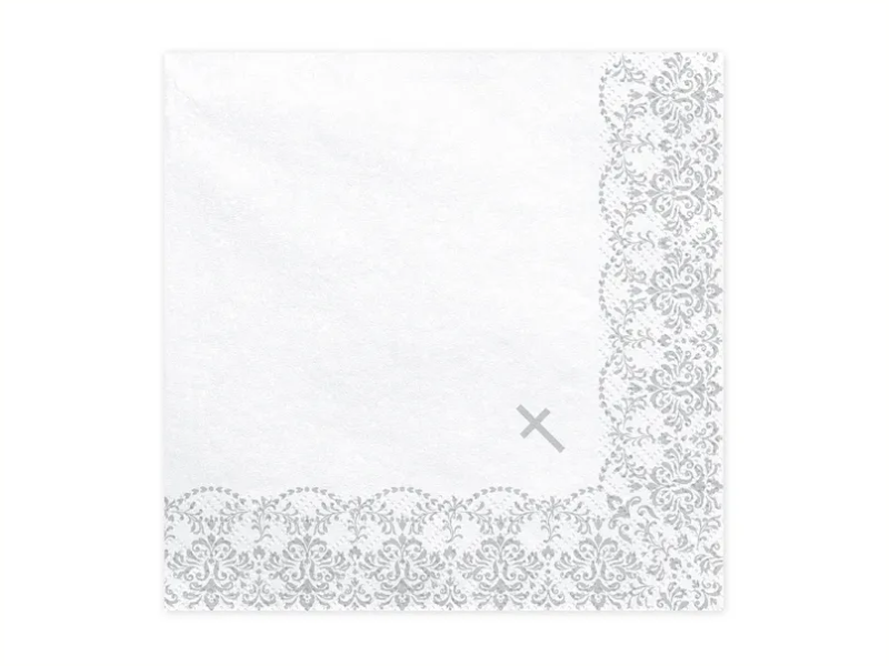 Eleganta vita pappersservetter med ett stilrent kors och dekorativt snirkligt mönster i grått - perfekta till dop, konfirmation, minnesstund eller andra högtidliga tillfällen.
