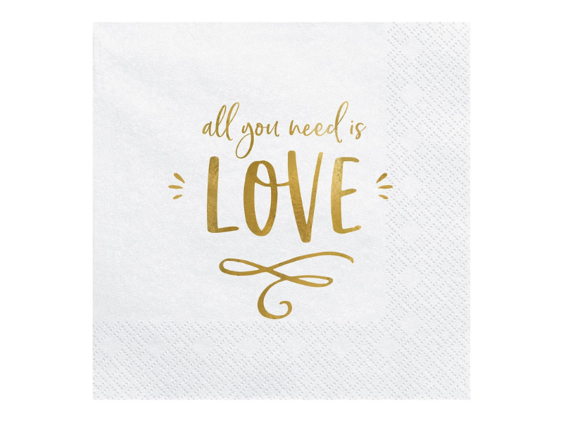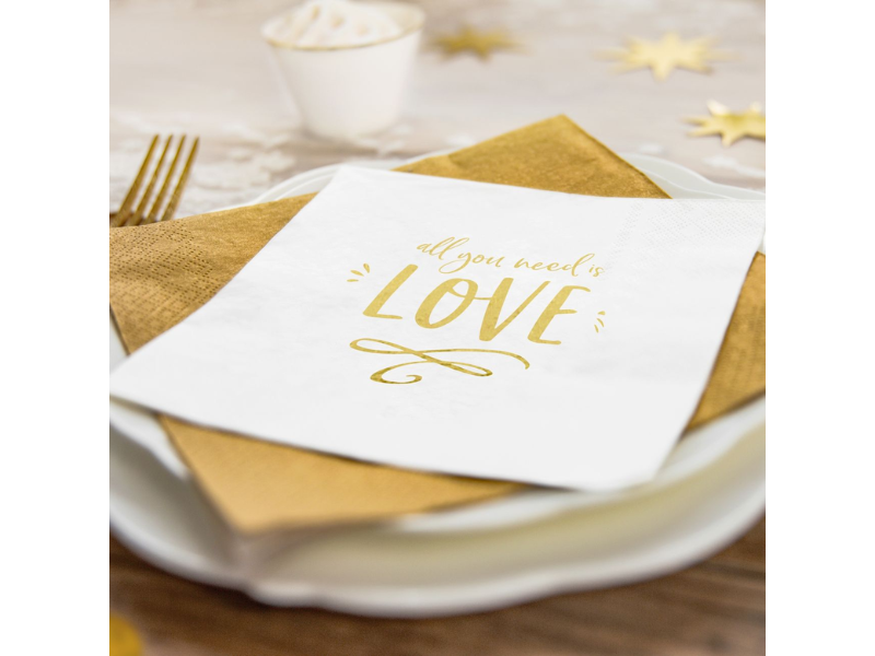 Duka vackert med dessa eleganta vita pappersservetter med den romantiska texten "all you need is LOVE" i skimrande guld. Perfekta för bröllop, förlovningsfester, alla hjärtans dag eller andra kärleksfulla tillställningar!