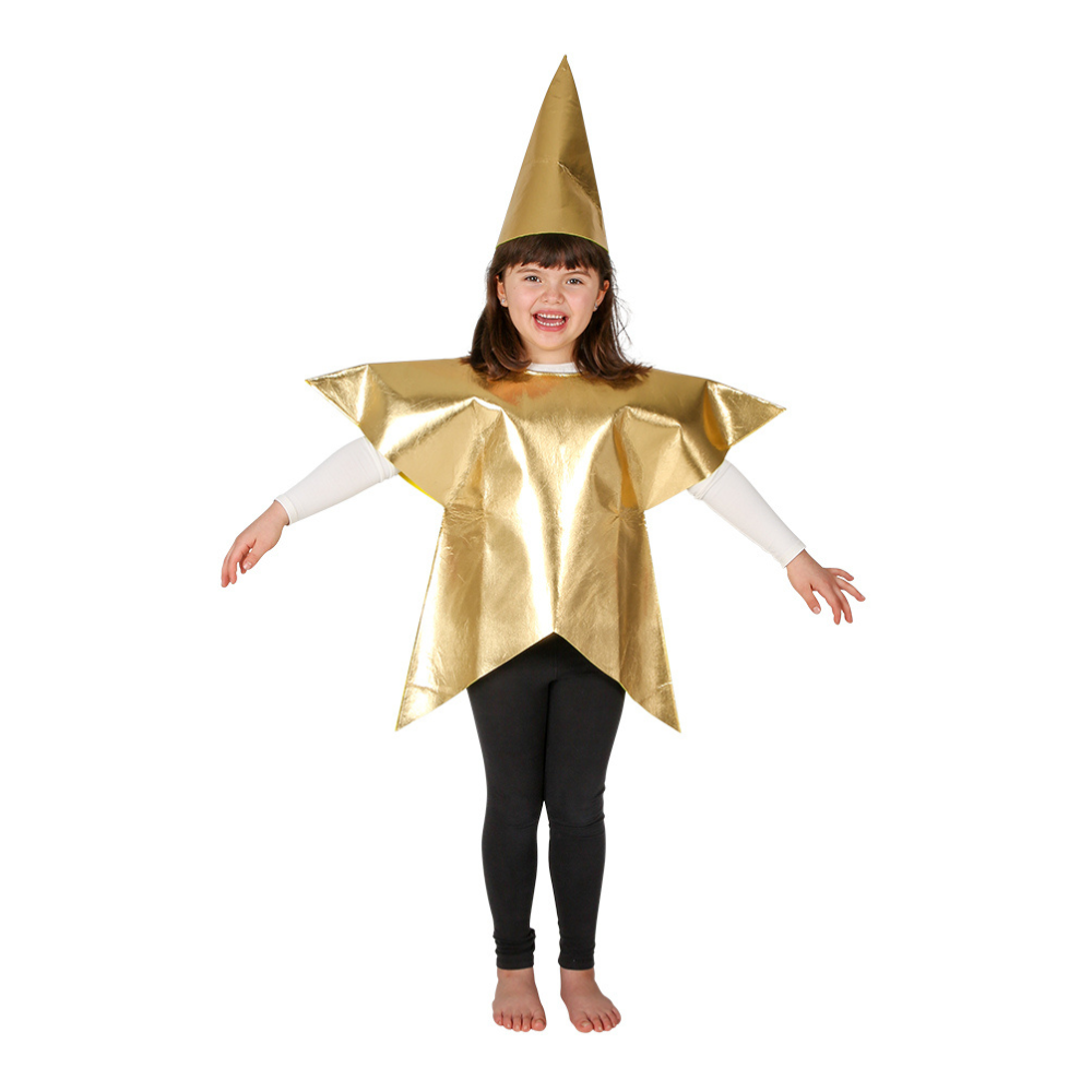 Låt ditt barn lysa klart i denna fullständiga stjärndräkt i guld - perfekt för maskerad, luciafirande alternativt julfest. Dräkten består av ett glänsande guldfärgat stjärntopp‑plagg kombinerat med en matchande hatt i konform för extra effekt. Materialvalet ger ett visuellt starkt uttryck och gör att barnet syns och känner sig som festens mittpunkt. Inga separata delar behöver kombineras - setet levereras som komplett dräkt + hatt.