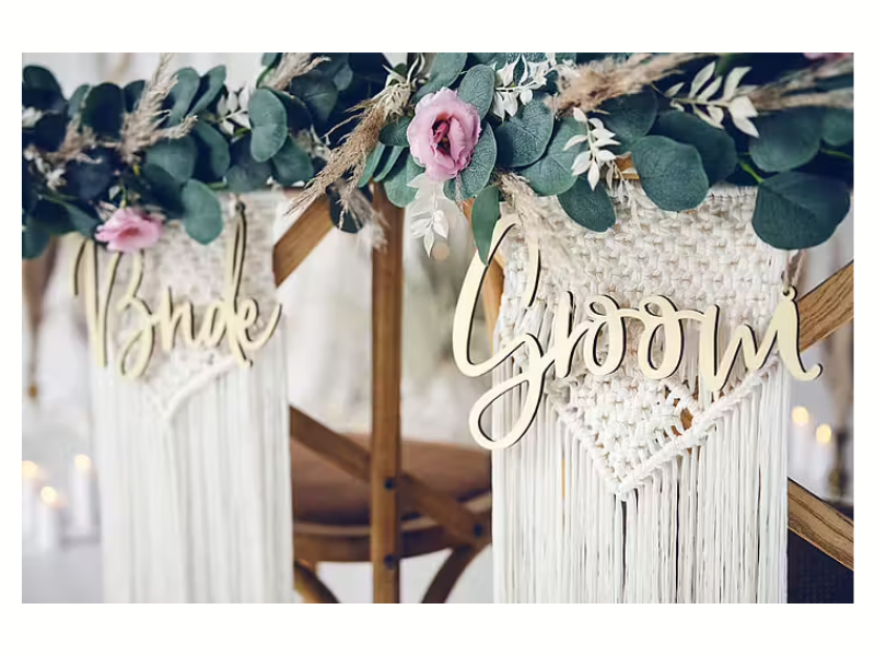 Skapa en romantisk och personlig touch till bröllopsdukningen med dessa eleganta stolsskyltar i trä! Med utskuren text i mjuka former pryder skyltarna brudparets stolar på ett stilfullt sätt: