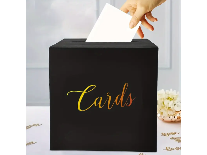 Denna eleganta svarta kortlåda med stilfull guldtext är den perfekta lösningen för att samla gratulationskort från gästerna på ditt bröllop. Designad för att både vara dekorativ och funktionell, erbjuder denna box en säker och vacker plats för att förvara kort och välönskningar under festligheterna. Med sitt klassiska utseende passar den in i de flesta bröllopsteman och bidrar till en organiserad och stilren atmosfär.
