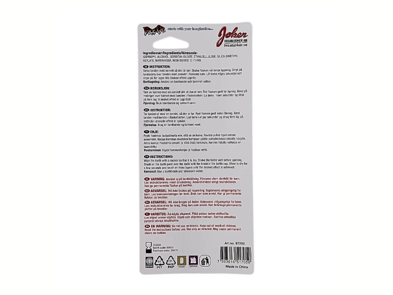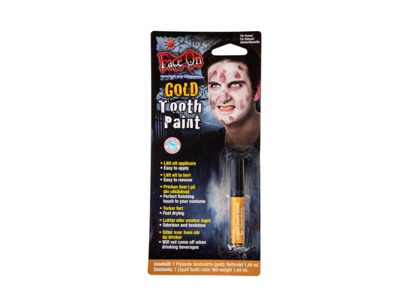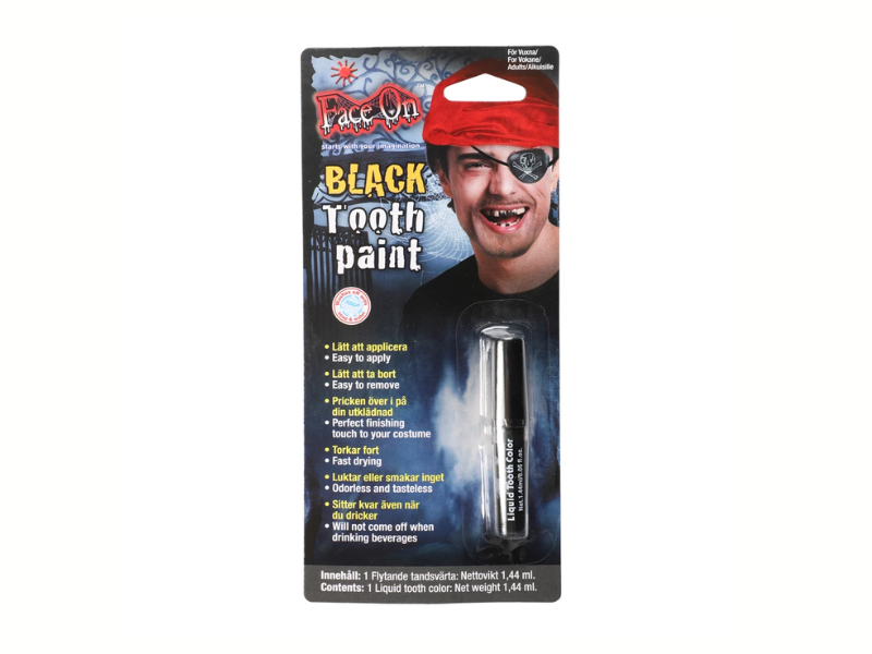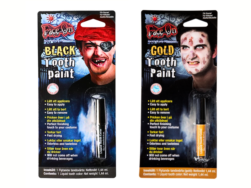 Den svarta tandfärgen skapar illusionen av saknade eller ruttna tänder - idealisk för zombies, pirater eller skräckfigurer. Den gyllene varianten ger istället en glammig och iögonfallande touch som passar disco- eller kungateman.