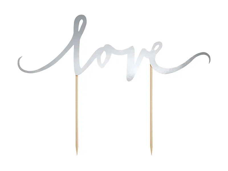 Stilren "Love" tårtdekoration i silver. Denna tårtdekoration är den perfekta avslutningen på din tårta, oavsett om det är ett bröllop, baby shower eller en annan kärleksfull tillställning. Med sin skimrande silverfinish och vackert formade bokstäver, ger den en lyxig och modern touch till vilken tårta som helst.