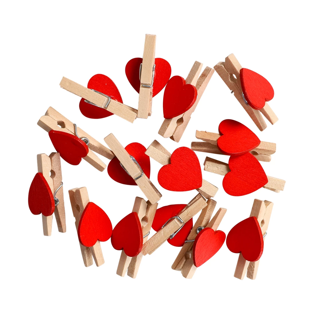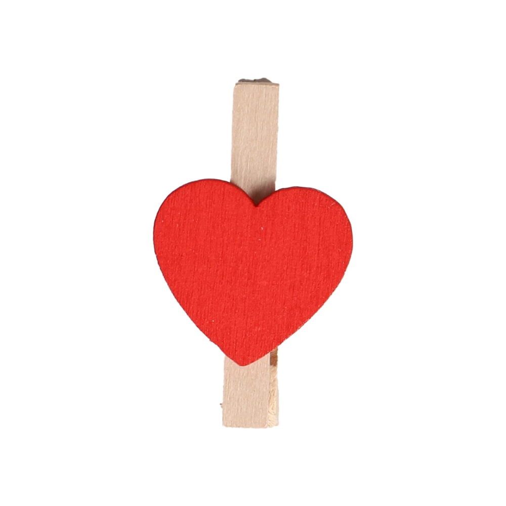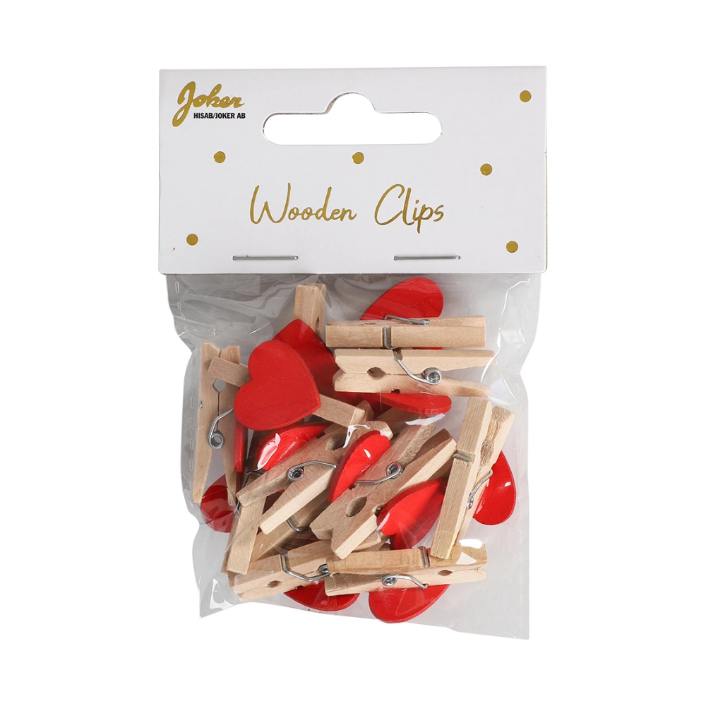 Dekorera med charm och kärlek med dessa träklämmor prydda med röda hjärtan. En fin detalj som passar perfekt för att fästa kort, bilder, dekorationer eller presentetiketter och samtidigt sprida en romantisk känsla.