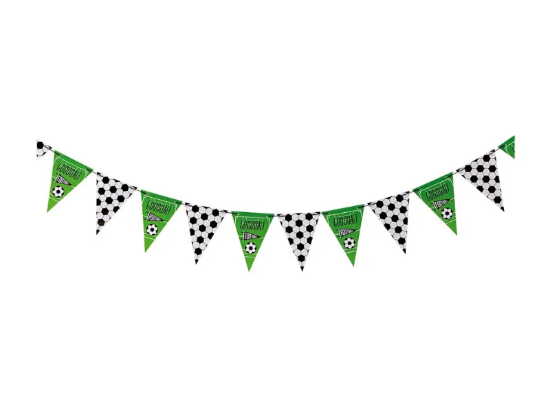 Höj stämningen på kalaset med denna pappersvimpel i härligt fotbollstema! Perfekt som dekoration till barnkalas, sportfester eller födelsedagar med fotbollsälskande gäster.