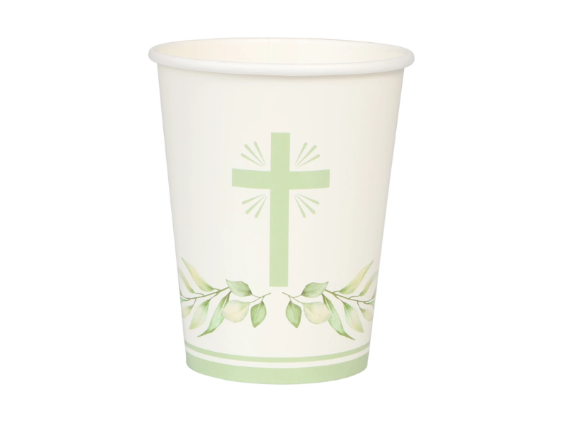 Fira med stil! Dessa vita pappersmuggar har ett elegant grönt tryck med en slingrig bladkrans och ett kors, vilket gör dem perfekta för dop, konfirmation eller andra högtidliga tillfällen.
